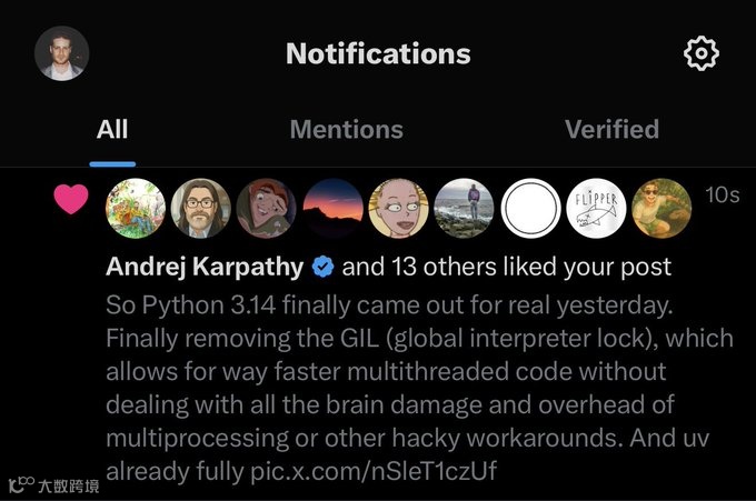 Andrej Karpathy 也在 X 上点赞这个贴文,就像是一记注脚:这一次,Python 的并发故事真的开始加速了。