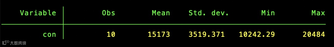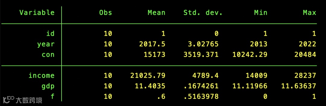 summarize id year con income gdp f ,separator(3) //每3个变量画一条分界线,视觉更清晰