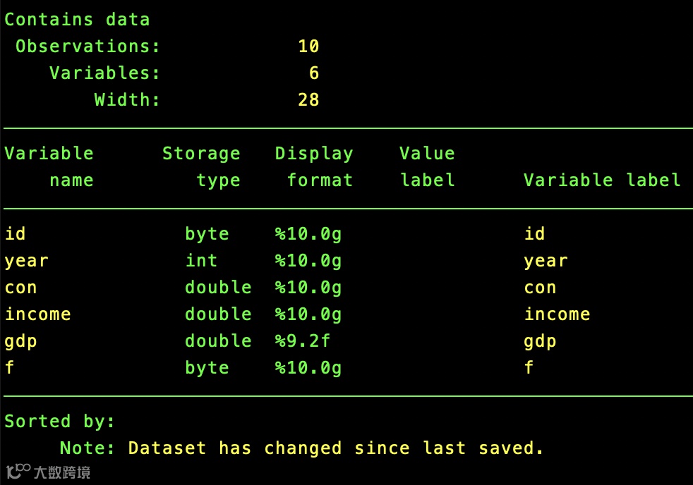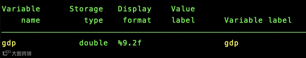 describe 命令:快速查看数据结构。 describe 命令是查看数据集的基本结构的第一步,输出结果包含每个变量的名称、储存方式、显示格式、变量标签和变量值标签。