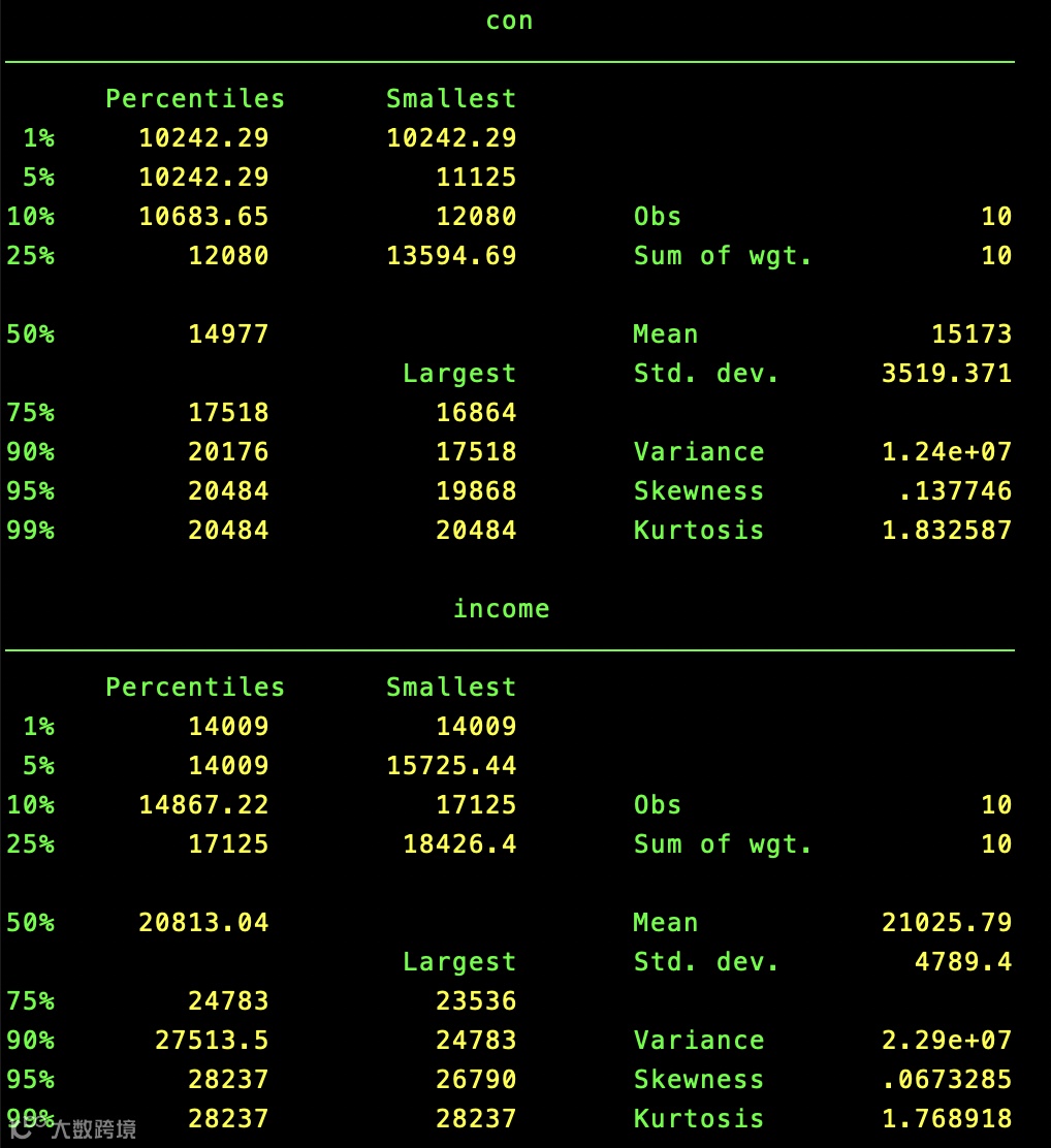 summarize con income, detail //显示con和income的细节情况