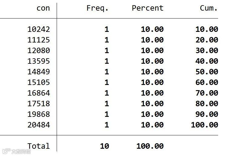 tabulate con,sort //通过sort排序并创建一维频数表