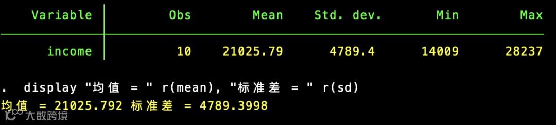 summarize income //计算统计量display "均值 = " r(mean), "标准差 = " r(sd) //展示统计量