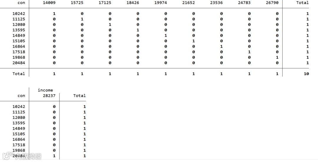 tabulate con, plot // 自动生成条形图,更加直观地理解频数分布。stata17版本以上tabulate income, nofreq // 只显示百分比tabulate con, matcell(frequency_matrix) // 把频数表存入名为frequency_matrix的矩阵中tabulate con income, chi2 expected // 卡方检验