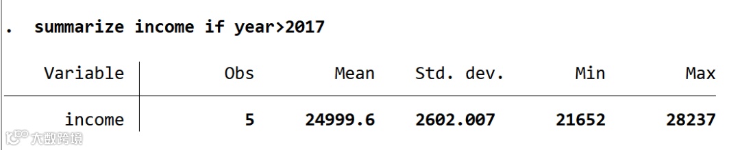 *if子句:如果我们只想查看满足某个条件的数据的描述性统计量,可以使用 if命令。例如,查看 income 在大于2017年的描述性统计: