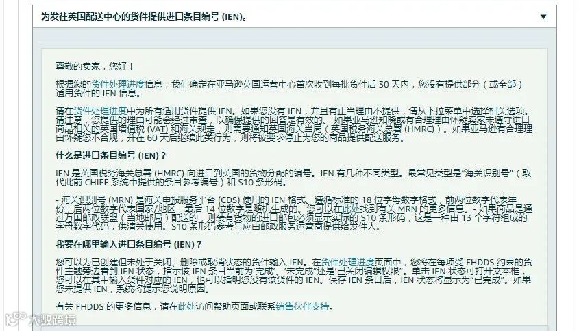 从邮件内容来看,根据卖家的货物处理进度信息,其确定在英国运营中心首次收到每批货件后的30天内,若没有提供部分(或全部)适用货件的IEN信息,则需要为所有适用货件提供IEN,若没有IEN或正当理由,并且60天后内仍继续该类行为,将被停止商品配送服务。