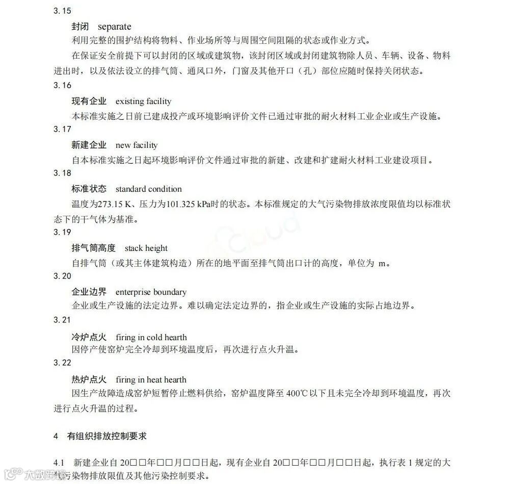 新建企业自2026年1月1日起,现有企业自2027年7月1日起实施以上标准。自以上标准实施之日起,铅、锌工业大气污染物排放控制不再执行《铅、锌工业污染物排放标准》( GB25466-2010 )及其修改单中的相关规定,耐火材料工业大气污染物排放控制不再执行《大气污染物综合排放标准》( GB16297-1996 )、《工业炉窑大气污染物排放标准》( GB9078-1996 )中的相关规定。