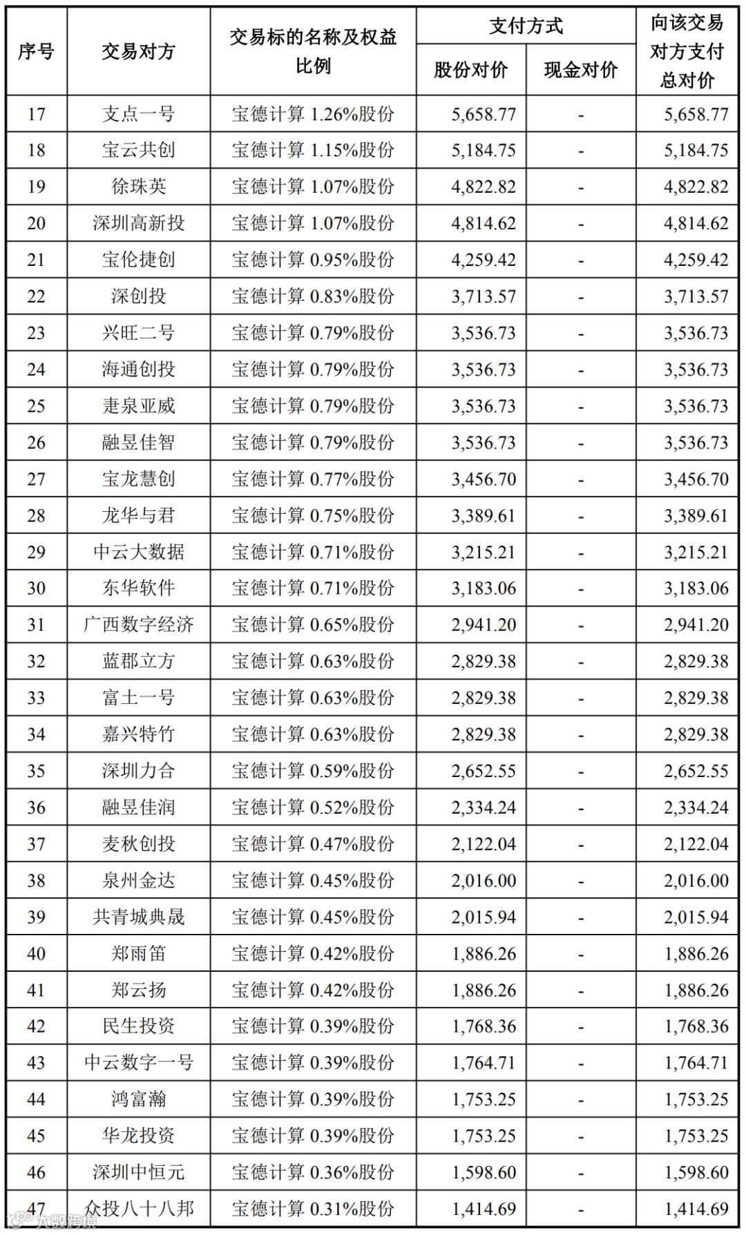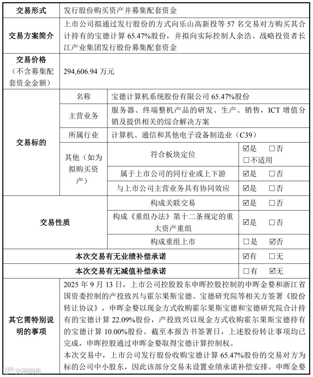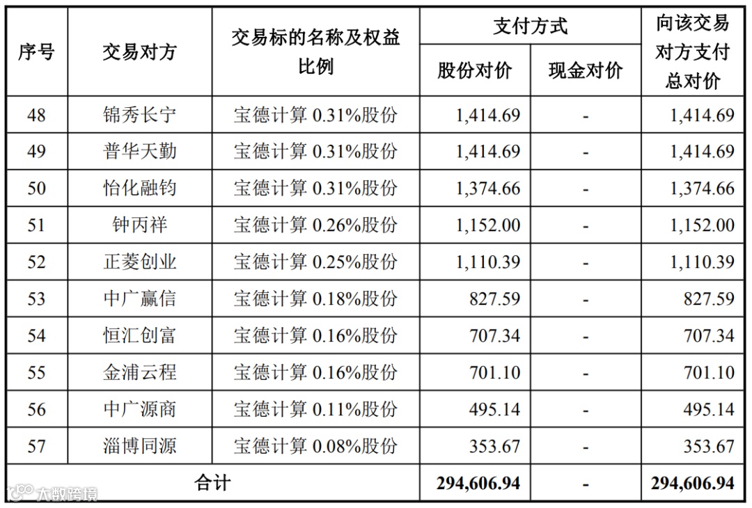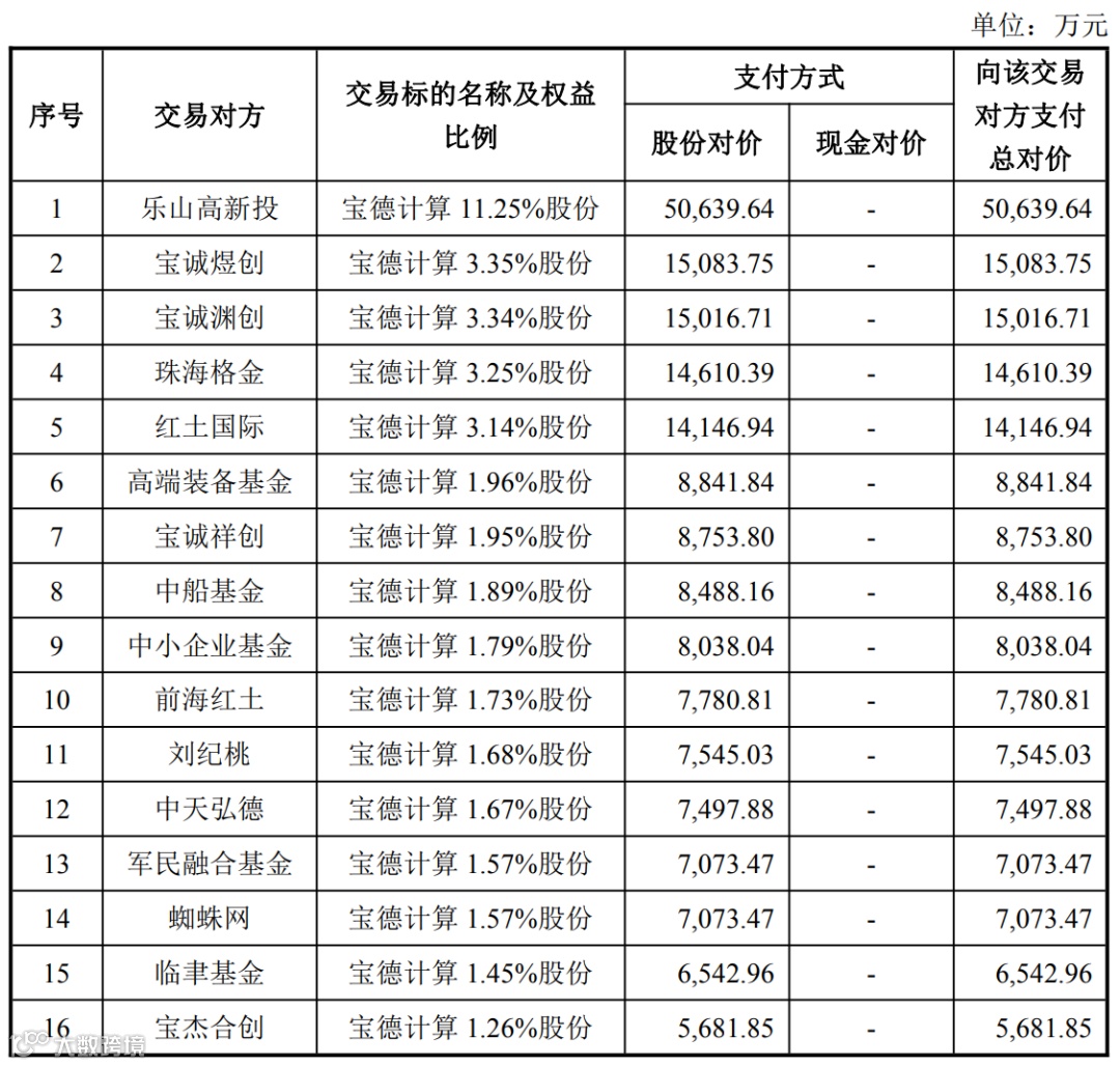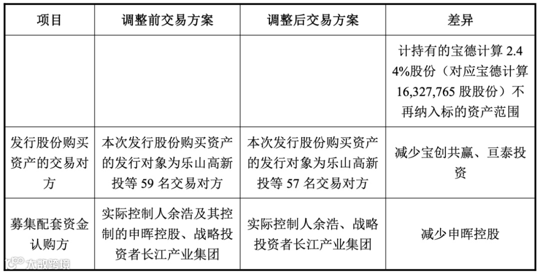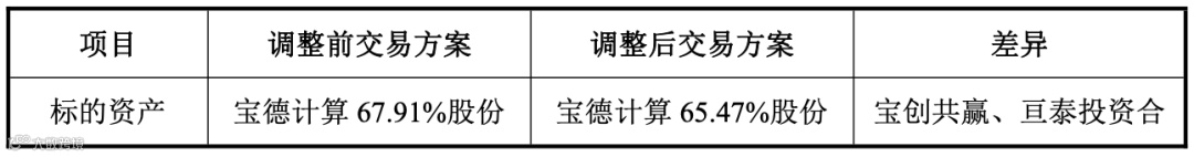 值得提的是,经交易各方协商一致,原交易对方宝创共赢、亘泰投资退出本次交易,不再以其合计持有的宝德计算 2.44% 股份(对应宝德计算 16,327,765 股股份)继续参与本次交易。