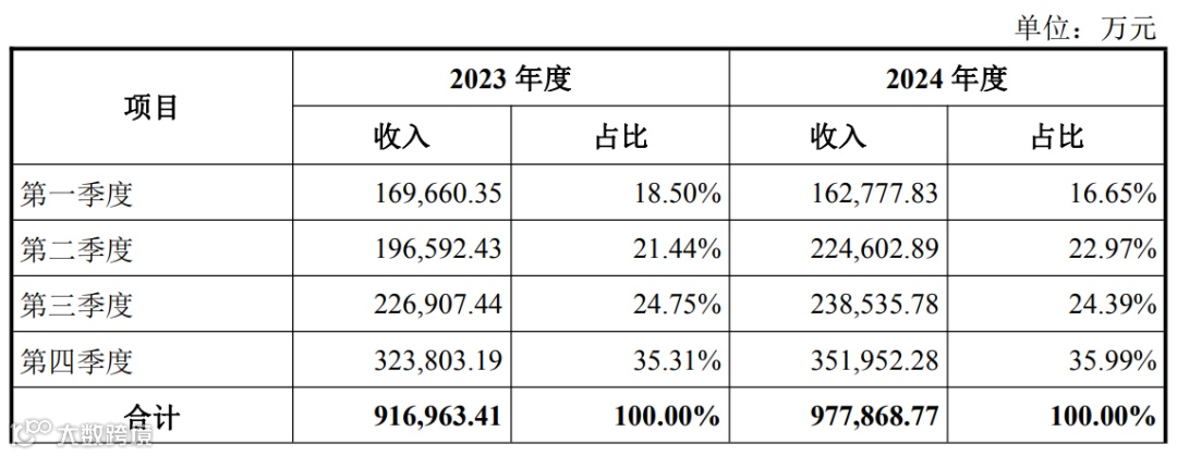 营业收入分季度构成如下: