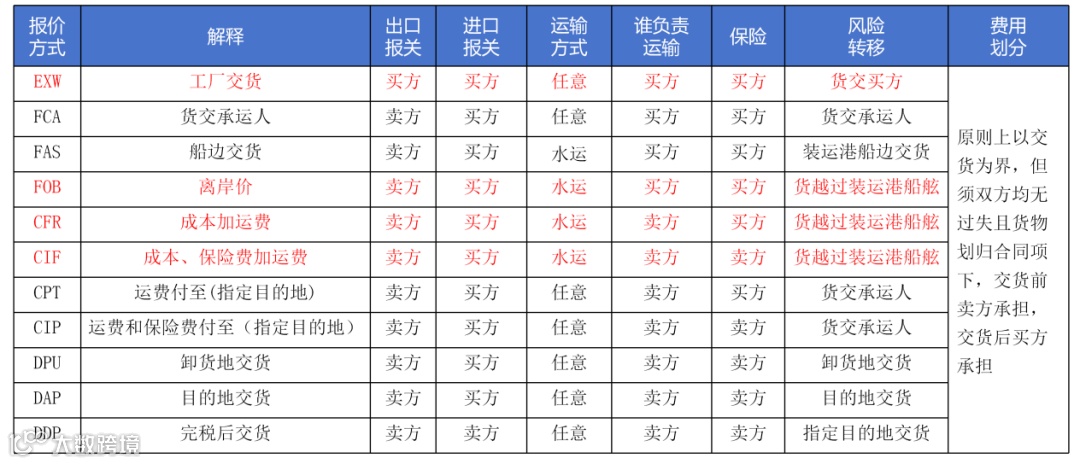 这11种外贸成交方式,从EXW到DDP,卖方的责任和风险从小到大,买方的责任和风险从大到小。