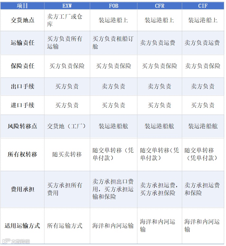 一句话核心区别:这四种方式的根本区别,就是卖家负责把货送到哪,钱就付到哪。从EXW到CIF,卖家送得越来越远,承担的费用也越来越多。