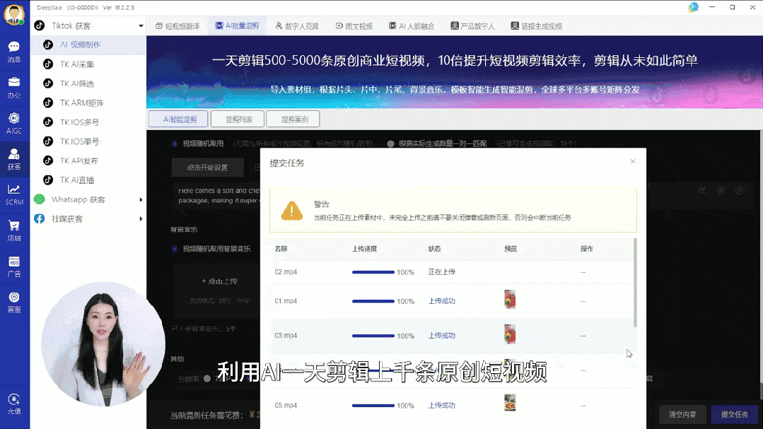 ✅AI批量混剪:一天剪辑500-5000条原创商业短视频,10倍提升短视频剪辑效率,剪辑从未如此简单,导入素材组,根据片头、片中、片尾、背景音乐、模板智能生成智能混剪,全球多平台多账号矩阵分发