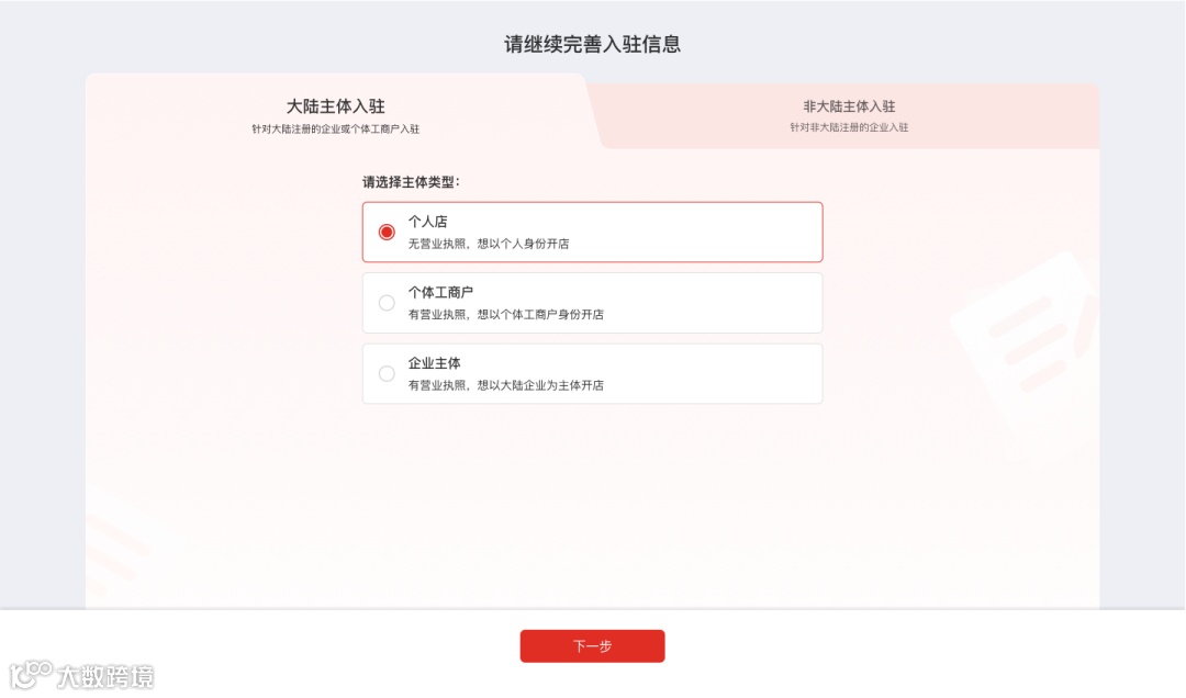 1. 选择主体类型,目前支持大陆个人店、大陆个体工商户、大陆企业、香港企业