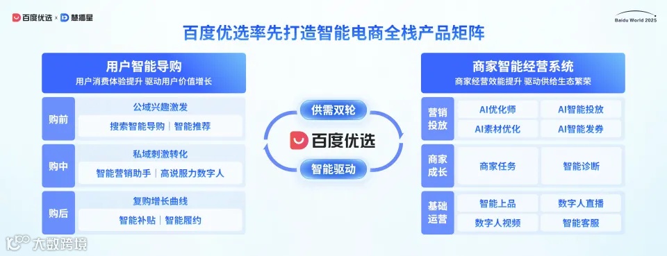 作为最早占位智能电商的平台,平晓黎披露,今年双11期间,100%商家使用至少1种AI工具,76%商家使用3种以上。百度优选打造的智能电商全栈产品矩阵,包含面向商家的“智能经营系统”与面向用户的“智能导购”,助力电商实现跨越式增长。