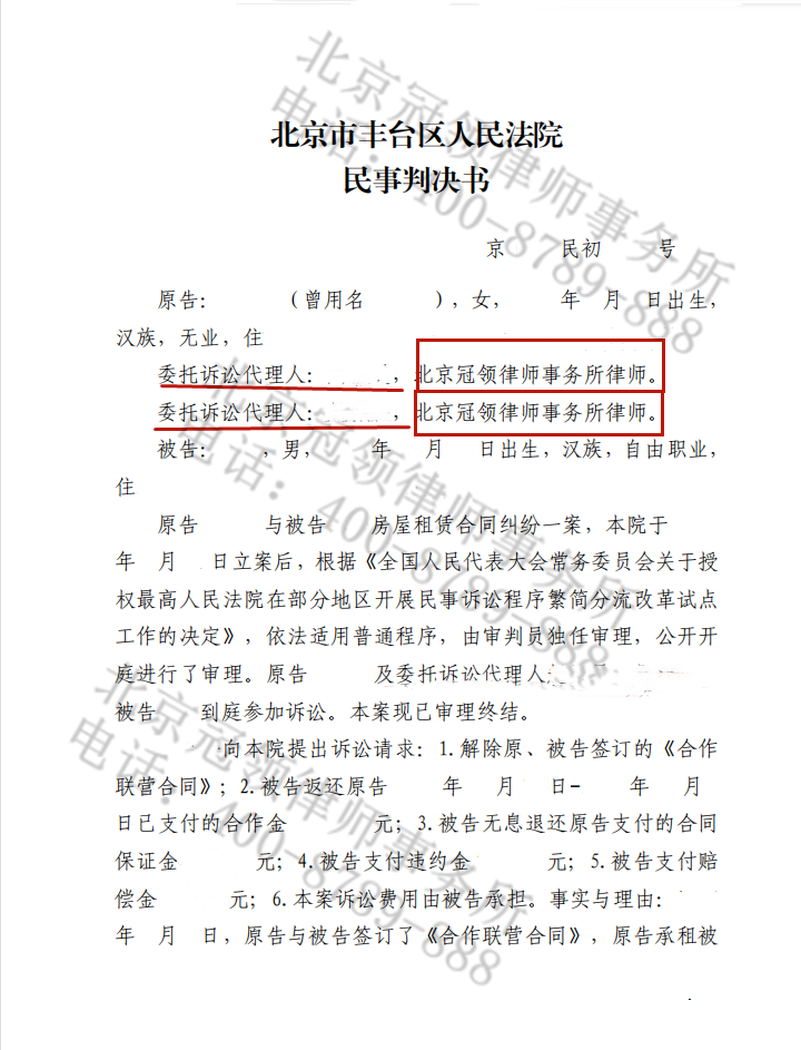 李女士无奈之下,找到了冠领律所,希望冠领律师能够助力维权,通过诉讼方式解除《合作经营合同》,让储某返还已经支付的合作金、无息退还合同保证金,并且支付违约金、赔偿金。冠领律师接受委托,庭前认真调查,庭审中据理力争,现迎来胜诉,成功帮助李女士维护其合法权益。