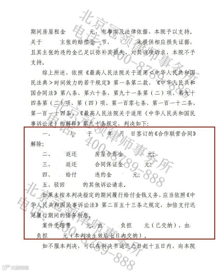 法院采纳了冠领律师的观点,最终判决:双方签订的《合作经营合同》解除;储某返还李女士支付的合作金以及合同保证金;储某给付给李女士违约金。