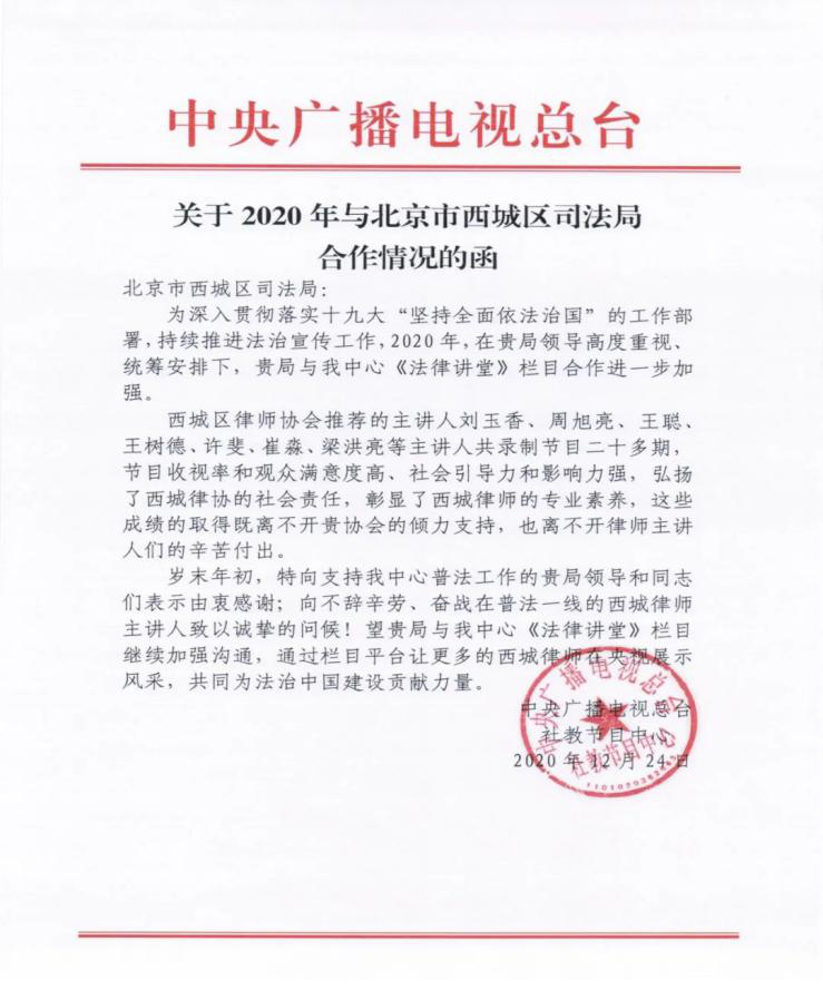 中央广播电视台社教节目向西城司法局发送了一封感谢函,函中对西城区律师协会推荐的《法律讲堂》主讲人表示了感谢,北京冠领律师事务所主任周旭亮律师正是受到点名表扬的律师之一。