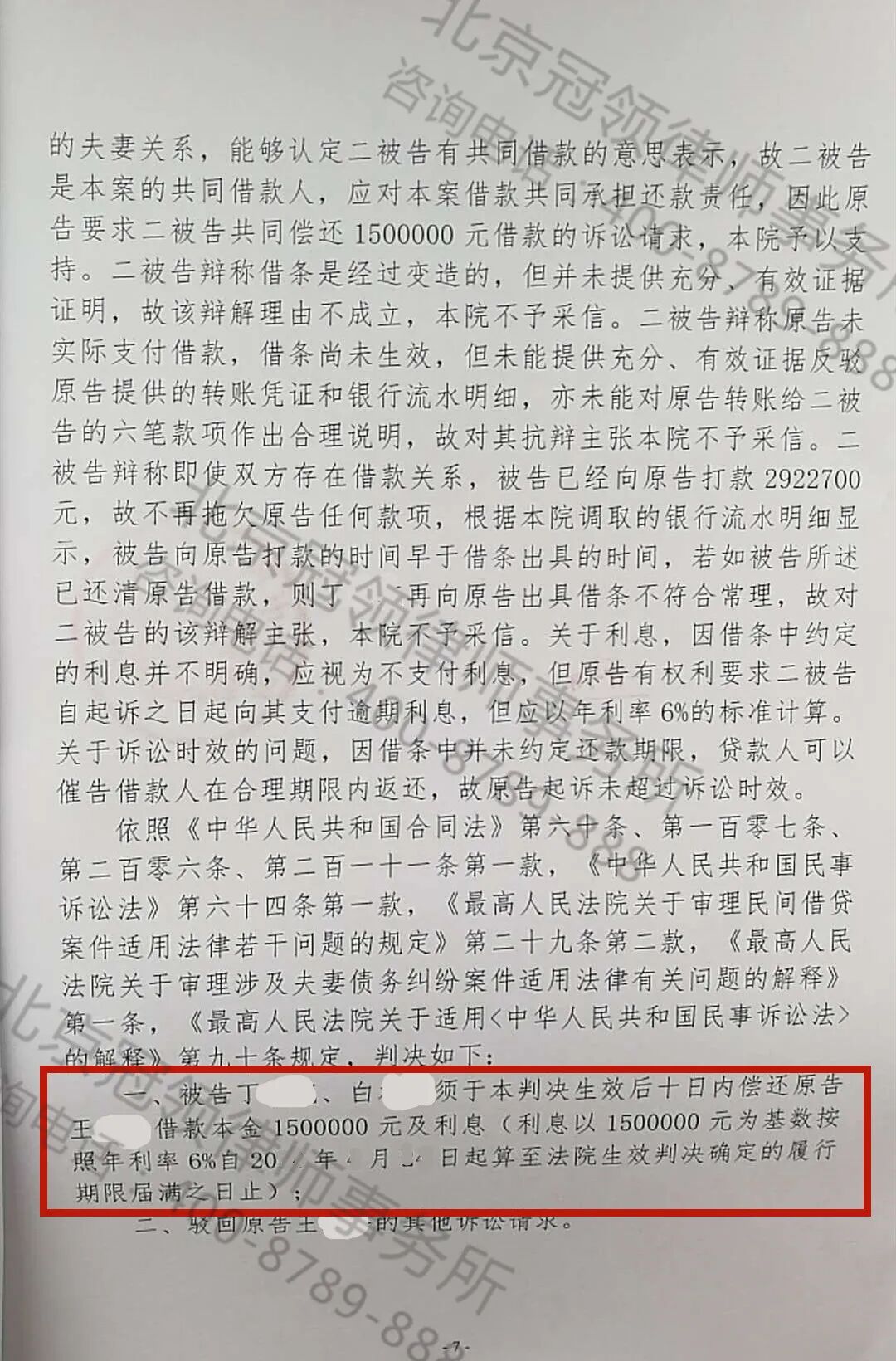 五大要点,直击要害,驳得对方哑口无言。最终,法院判令丁某、白某限期偿还王女士本金150万元,并按期支付相应利息。