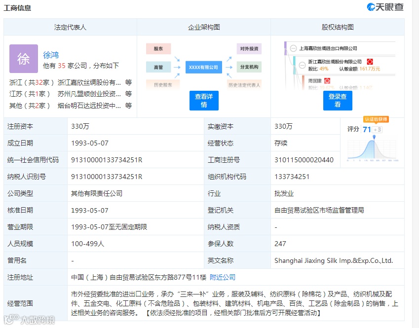 天眼查信息显示,上海嘉欣丝绸进出口有限公司由嘉欣丝绸(002404.SZ)控股49%,服装为其主要经营产品。杨国敏透露,该公司主要客户有ZARA、MASSIMO DUTTI等国际知名品牌。