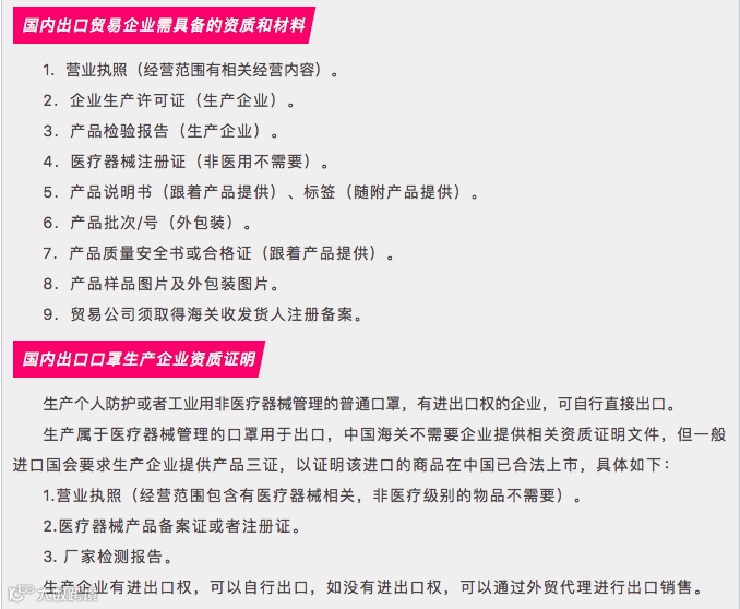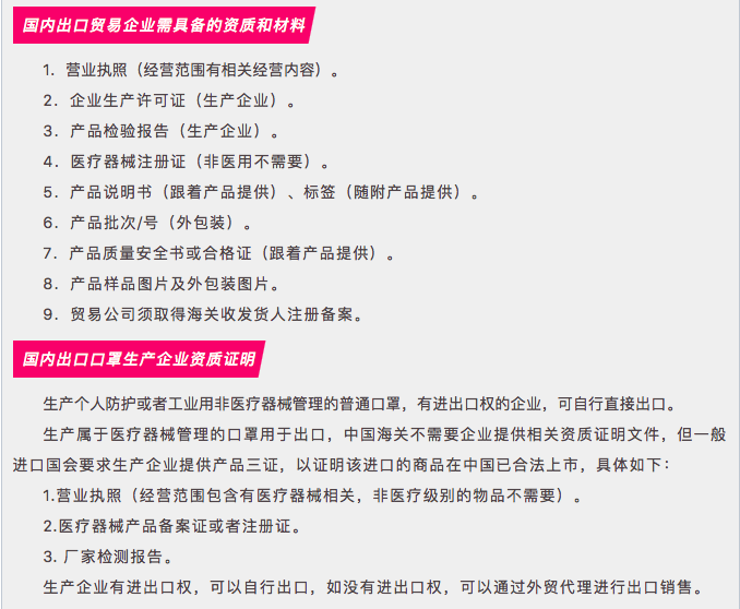但医用口罩属于医疗器械,因此对其的出口管理也更为严格。生产企业如有进出口权的,可以直接出口;而如果企业没有进出口权,需通过外贸公司出口,则外贸公司需要执有合法有效的营业执照(经营范围内加医疗器械销售),并进行二类医疗器械备案,出口时还需附上生产厂家的医疗器械相关资质证书和检测报告等。