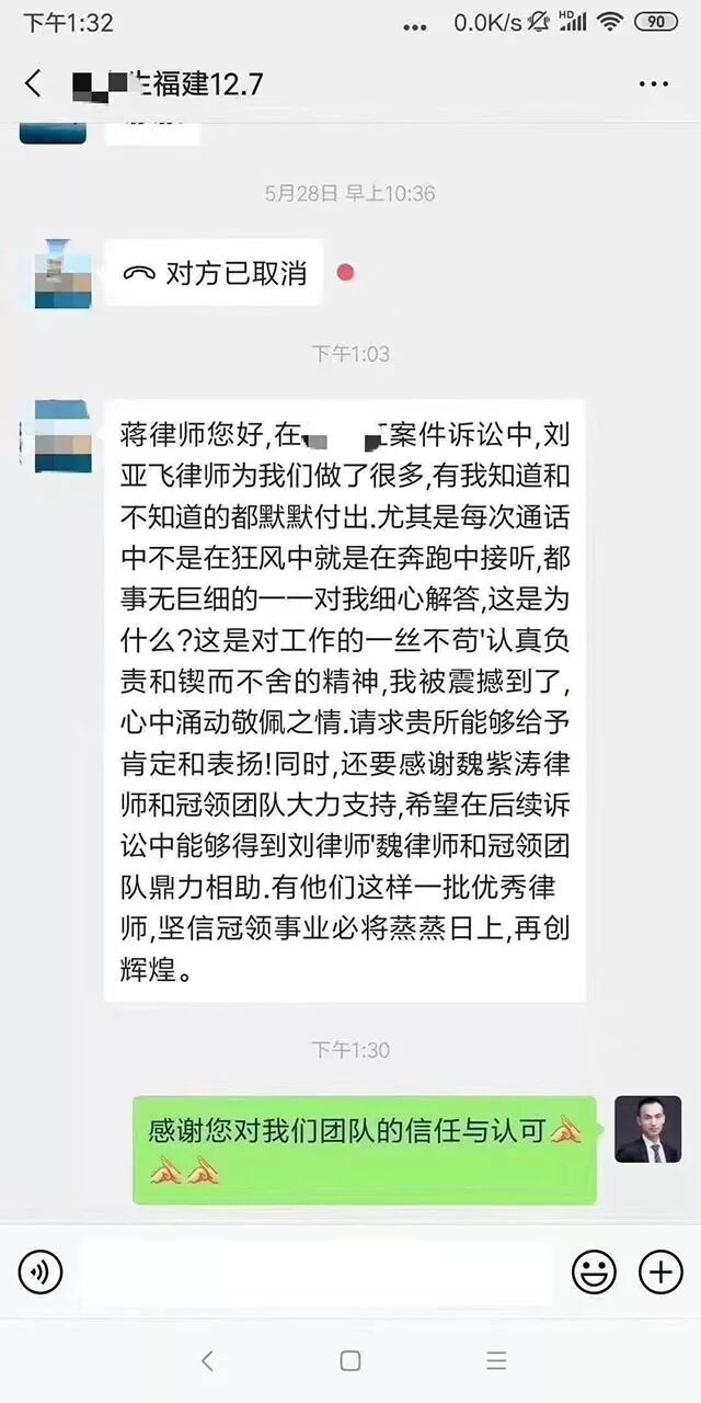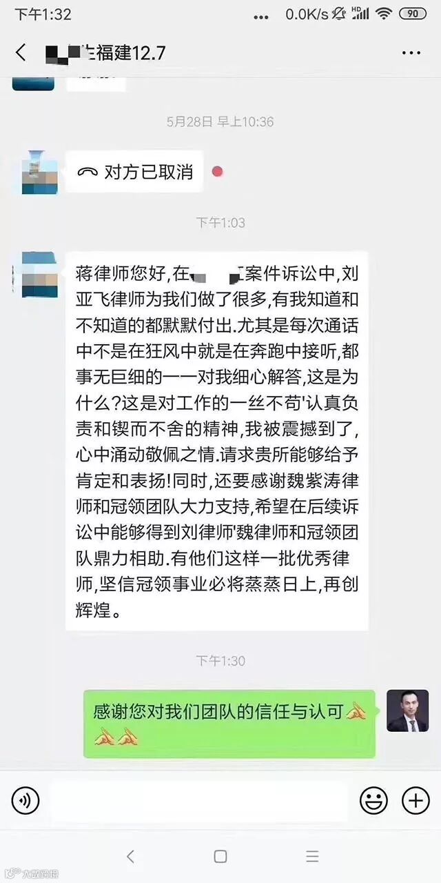 12月13日,福建当事人向冠领律师刘亚飞、实习律师魏紫涛表示感谢。