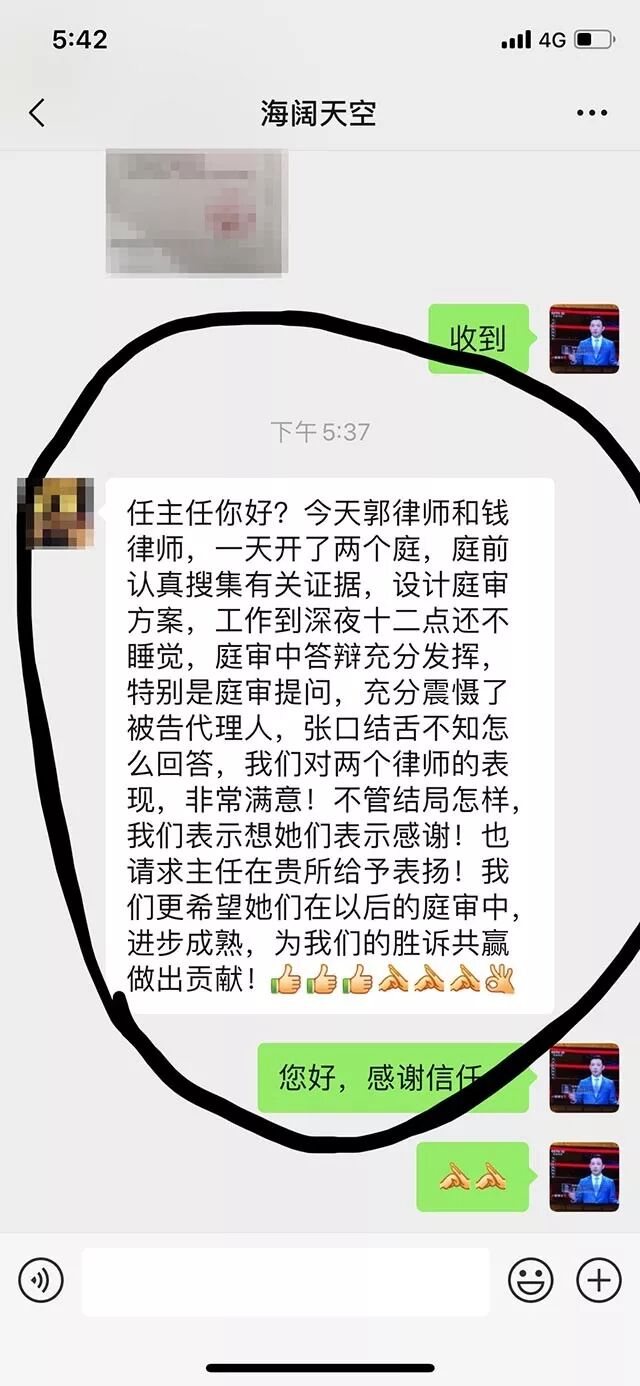 12月12日,菏泽当事人称赞冠领律师郭敏慧、实习律师钱亚洲的庭审表现,并向二位律师表示感谢。