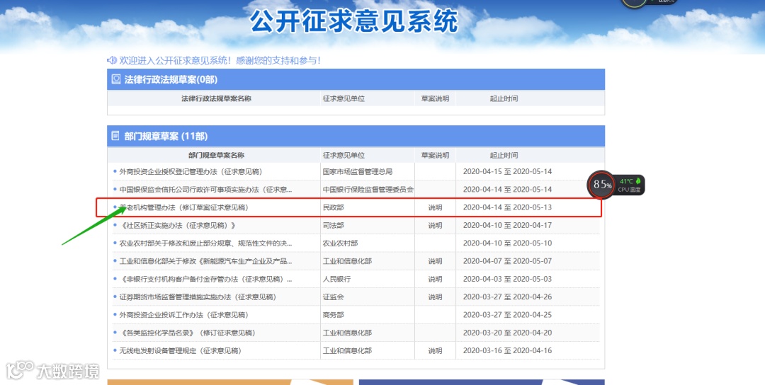 第一种方式,首先你需要登陆中国政府法制信息网(网址:www.chinalaw.gov.cn),点击上方“立法意见征集”栏目,会下拉出“进入征集系统”,点击它,在“部门规章草案”找到养老办法《征求意见稿》,然后就可以提出意见。见下方图片:
