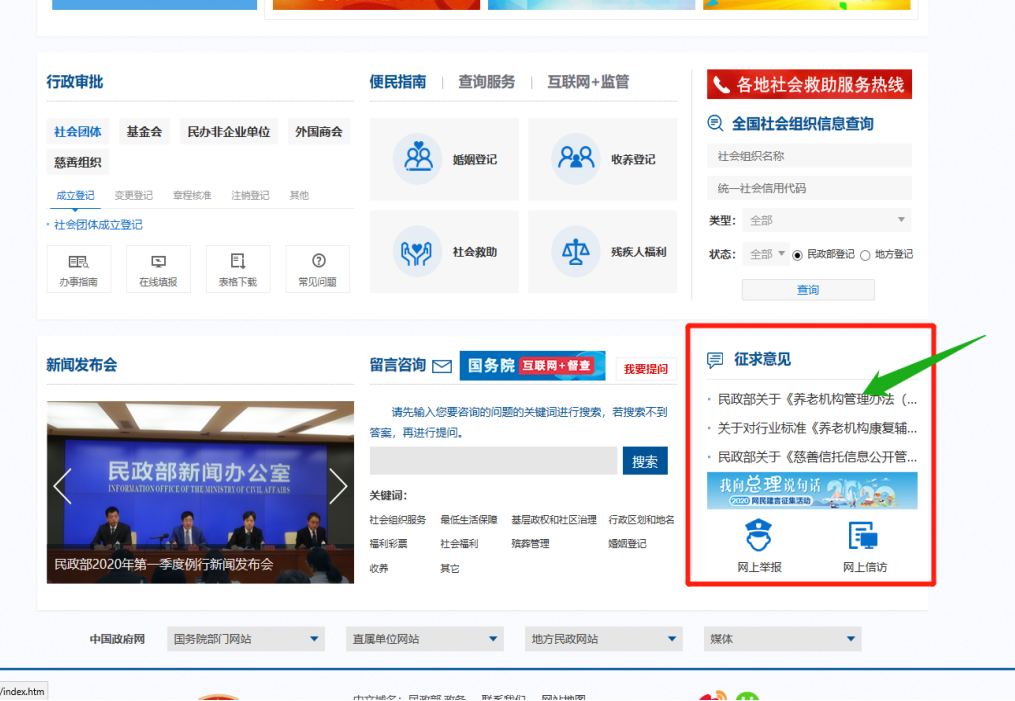 您也可以,直接点击民政部网站首页右下方“征求意见”栏,见图片,随后点击《民政部关于<养老机构管理办法(修订草案征求意见稿)>公开征求意见的通知》提交意见。见下方图片: