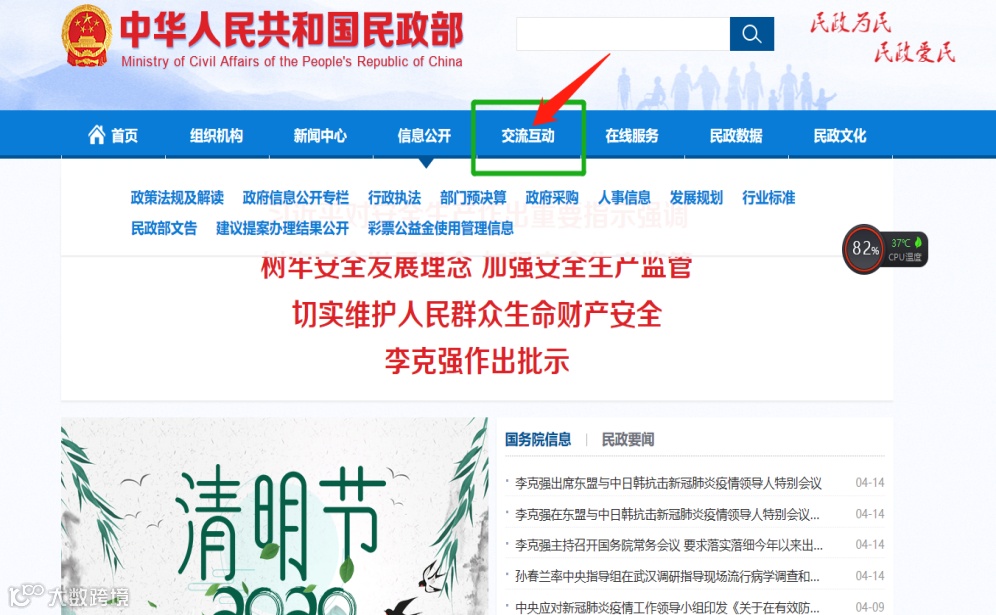 第二种方式,登录民政部网站(网址:www.mca.gov.cn),点击首页上方导航栏的“交流互动”,进入“征求意见”栏,在下方可以看到本次的征求意见稿,然后点击它就可以提意见了,见下方图片: