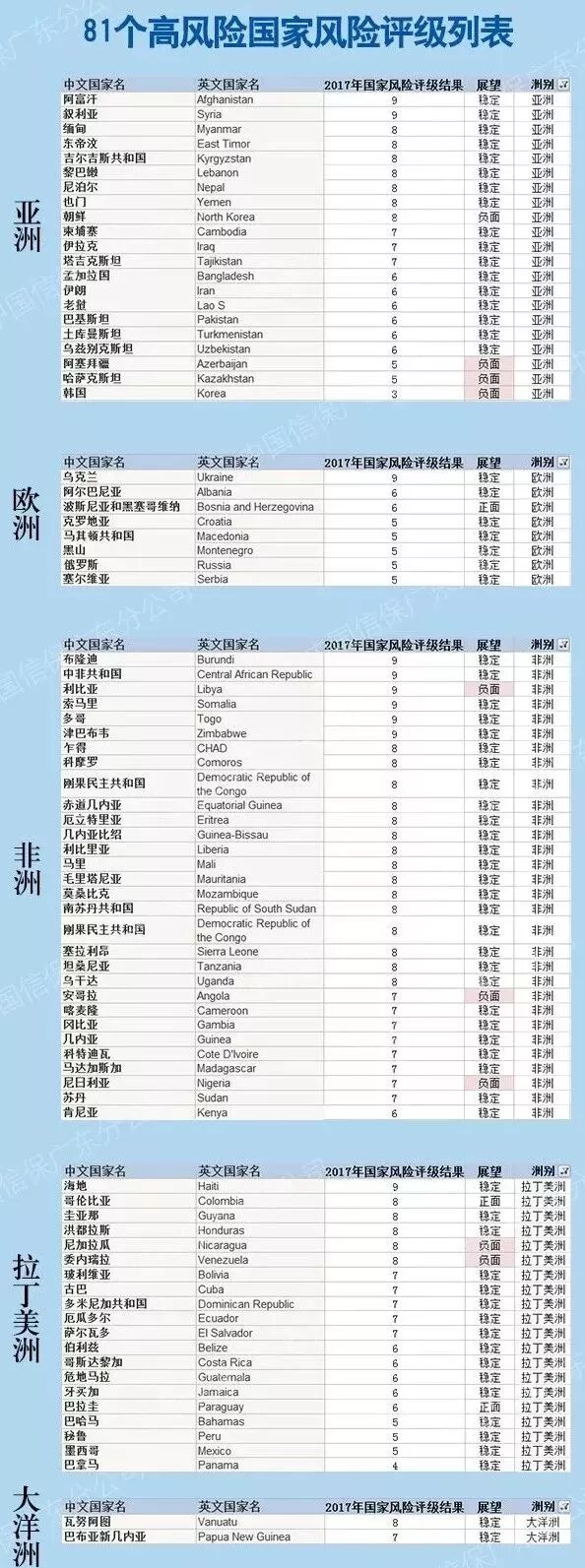 国家风险评级划分为1~9级(共9级),风险水平依次升高。国家风险展望分为“正面”“稳定”和“负面”三个层面。