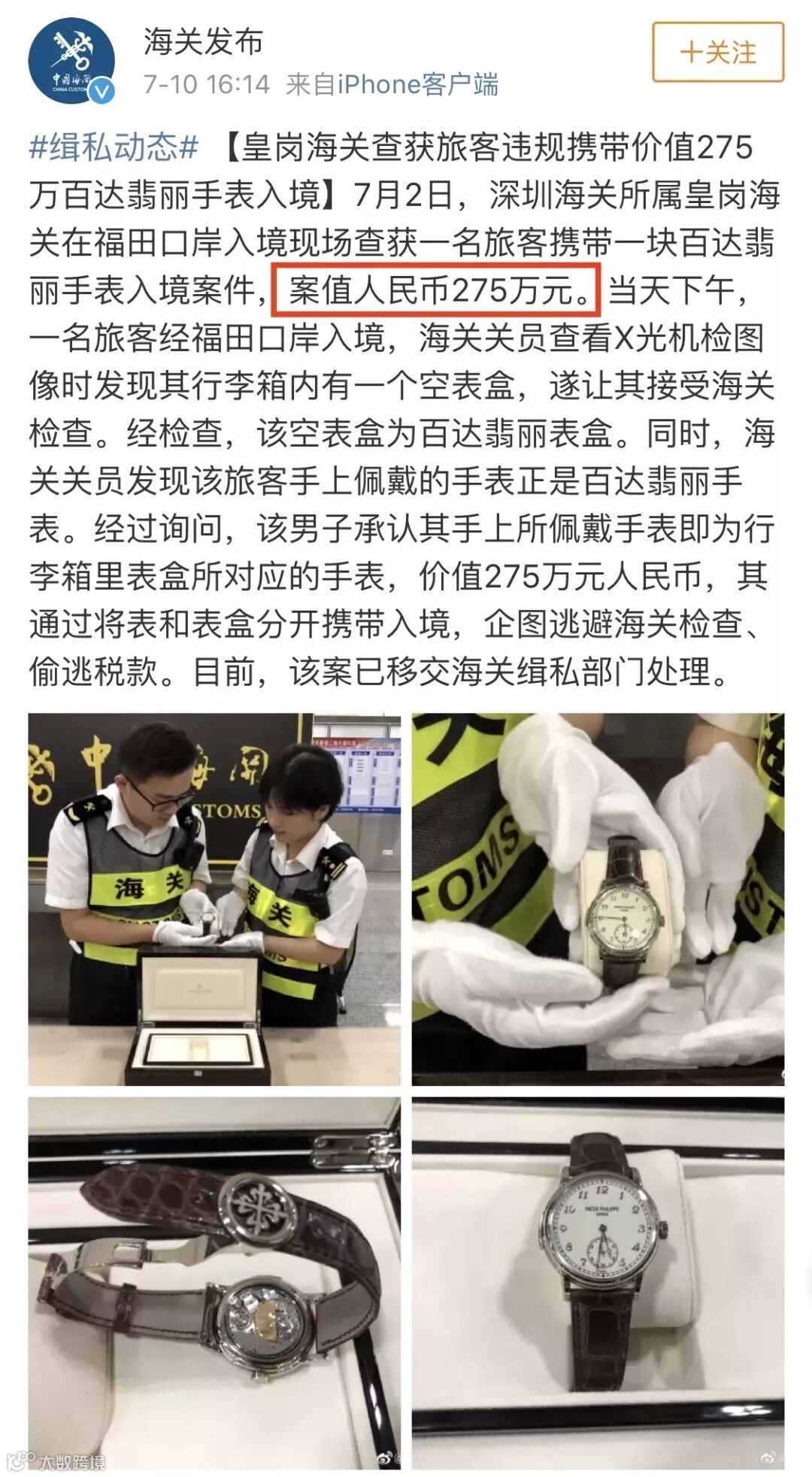经过询问,该男子承认其手上所佩戴手表即为行李箱里表盒所对应的手表,价值275万元人民币,其通过将表和表盒分开携带入境,企图逃避海关检查、偷逃税款。目前,该案已移交海关缉私部门处理。