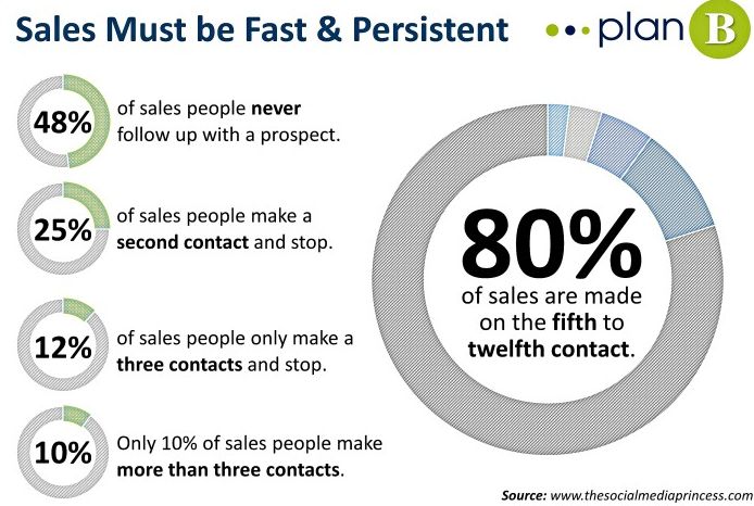 通过上面的图表我们发现,48%的业务员在1次跟进后就停止了。能做到3次以上跟进的业务员只有10%。而成功的销售基本上都会有5到12次的跟进。