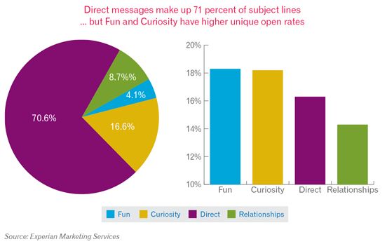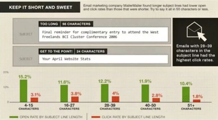 此外,要注意主题行的文字长度,从上面的图标我们发现,当涉及标题时,字数很重要,它会直接影响邮件的打开率和点击率。