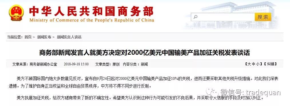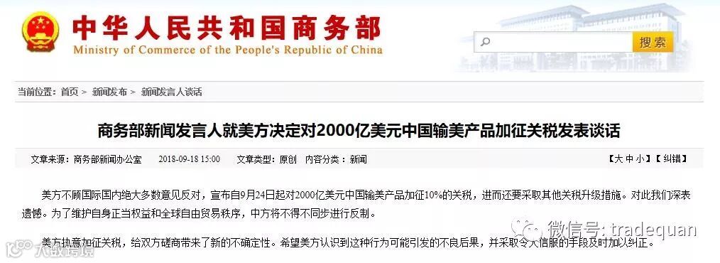 美方不顾国际国内绝大多数意见反对,宣布自9月24日起对2000亿美元中国输美产品加征10%的关税,进而还要采取其他关税升级措施。对此我们深表遗憾。为了维护自身正当权益和全球自由贸易秩序,中方将不得不同步进行反制。