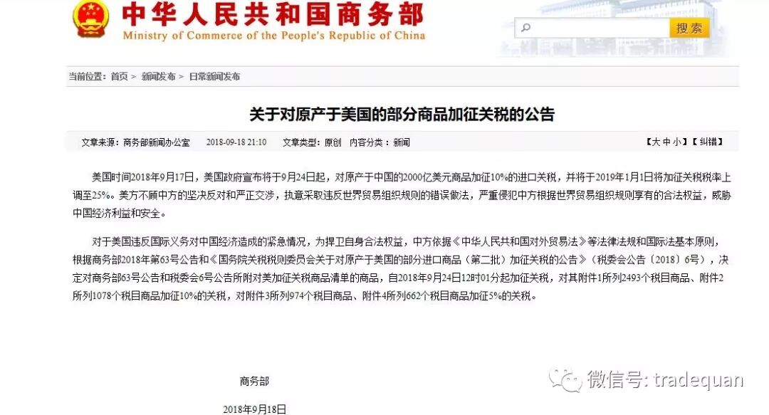 根据《中华人民共和国对外贸易法》《中华人民共和国进出口关税条例》等法律法规和国际法基本原则,经国务院批准,国务院关税税则委员会决定对原产于美国的5207个税目、约600亿美元商品,加征10%或5%的关税,自2018年9月24日12时01分起实施。如果美方执意进一步提高加征关税税率,中方将给予相应回应,有关事项另行公布。