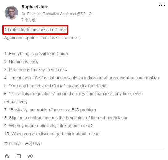拉斐尔今年在LinkedIn上发表了一篇帖子——在中国做生意的10条经验,引起很多老外点赞和评论。