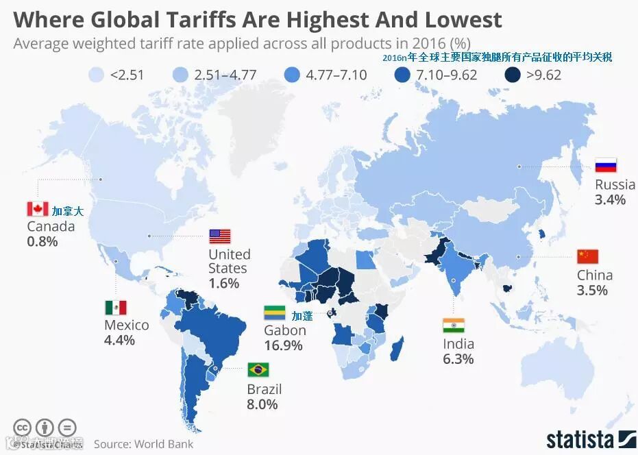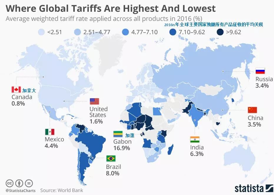 上图是世界银行按2016年产品进口份额进行的加权计算,不考虑北美自由贸易协定等区域关税细则。
