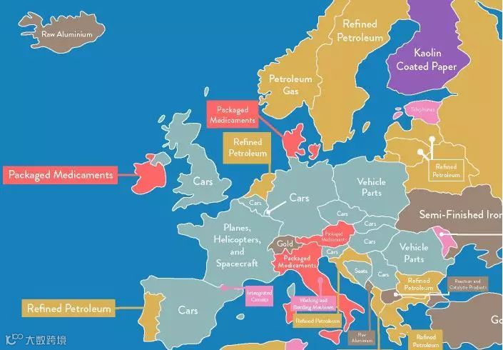 欧洲则以出口汽车、汽车部件为主。