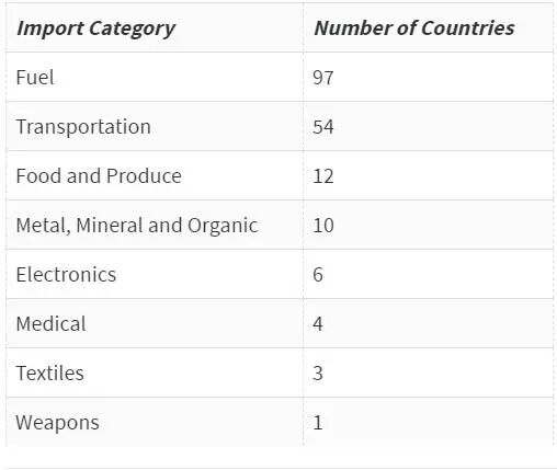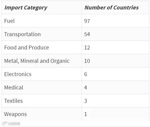 从进口方面看,全球有97个国家在全球贸易中进口了燃料,进口比重居第二的是交通运输工具。