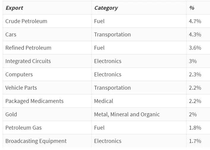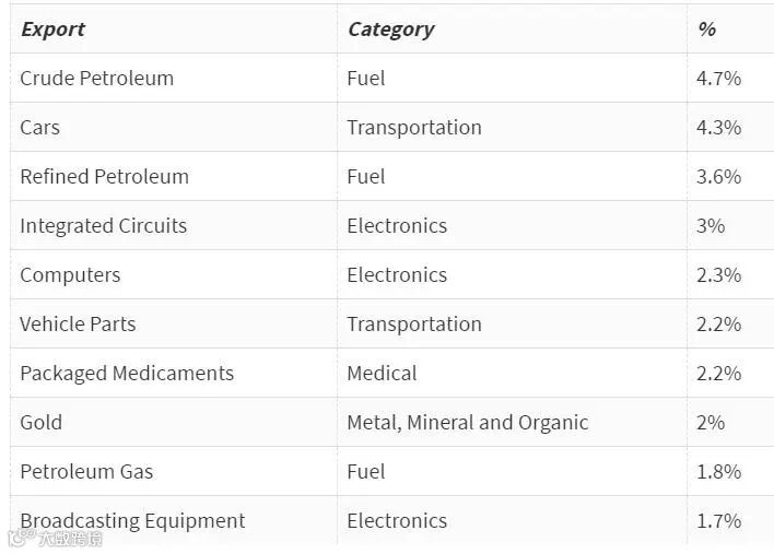 原油、汽车、精炼油、集成电路、计算机、汽车部件、成品药、黄金、天然气和无线设备。