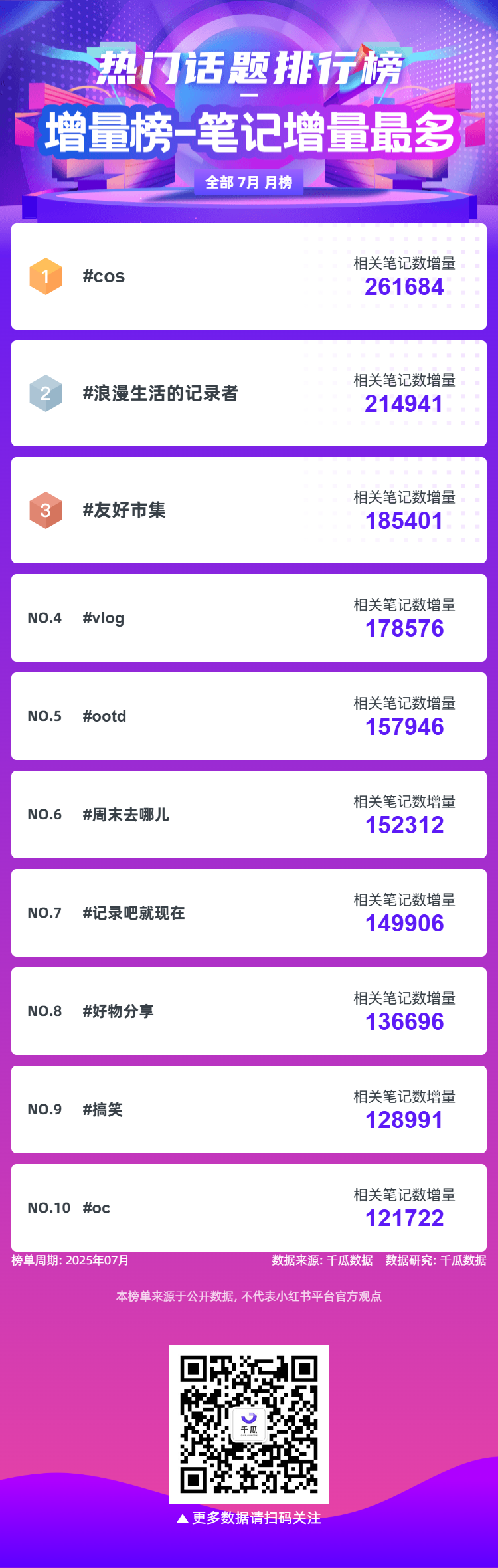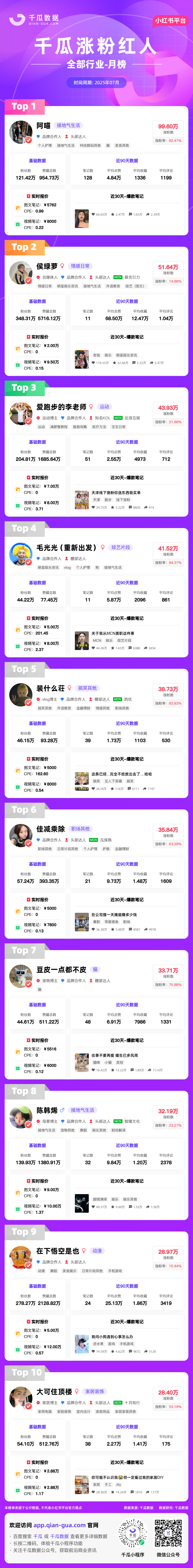 千瓜为大家整理了7月榜单月榜(小红书平台),千瓜涨粉红人榜、热门话题排行榜2大榜单,为大家提供小红书多方位的数据参考。