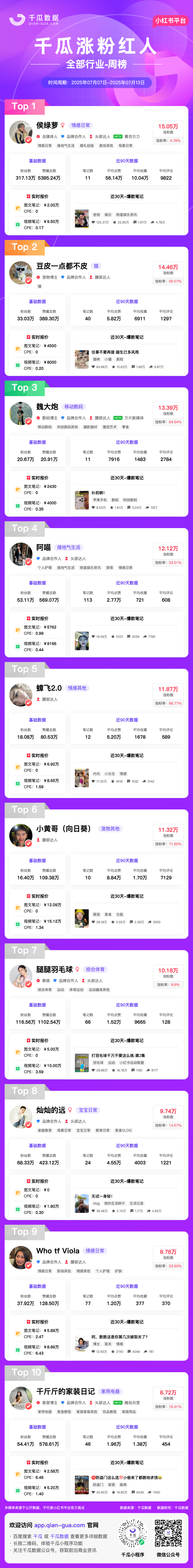 千瓜为大家整理了7月第2周榜单(小红书平台),千瓜涨粉红人榜、热门话题排行榜2大榜单,为大家提供小红书多方位的数据参考。