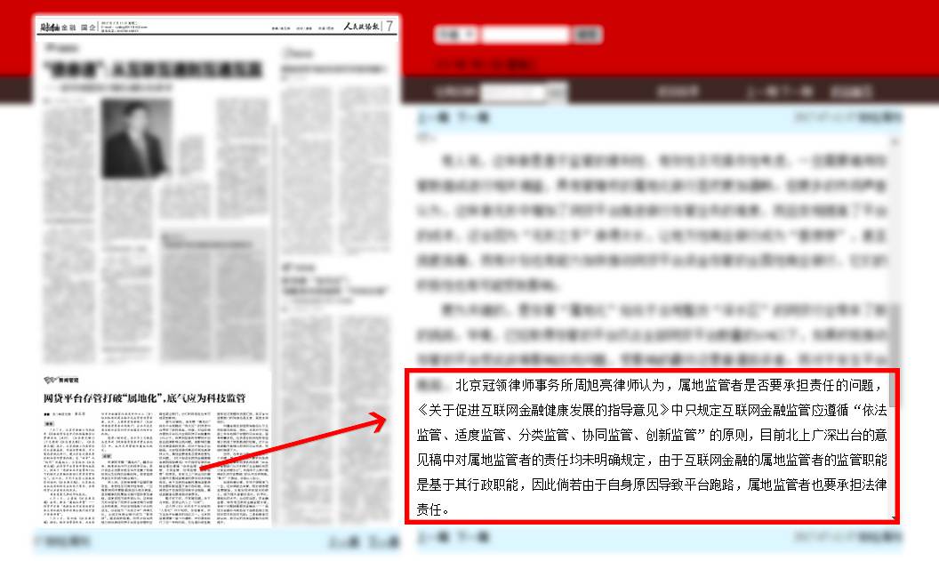 对此,北京冠领律师事务所主任、律师周旭亮认为,属地监管者是否要承担责任的问题,《关于促进互联网金融健康发展的指导意见》中只规定互联网金融监管应遵循“依法监管、适度监管、分类监管、协同监管、创新监管”的原则。目前北上深出台的意见稿中对属地监管者的责任均未明确规定,由于互联网金融的属地监管者的监管职能是基于其行政职能,因此倘若由于自身原因导致平台跑路,属地监管者也要承担法律责任。