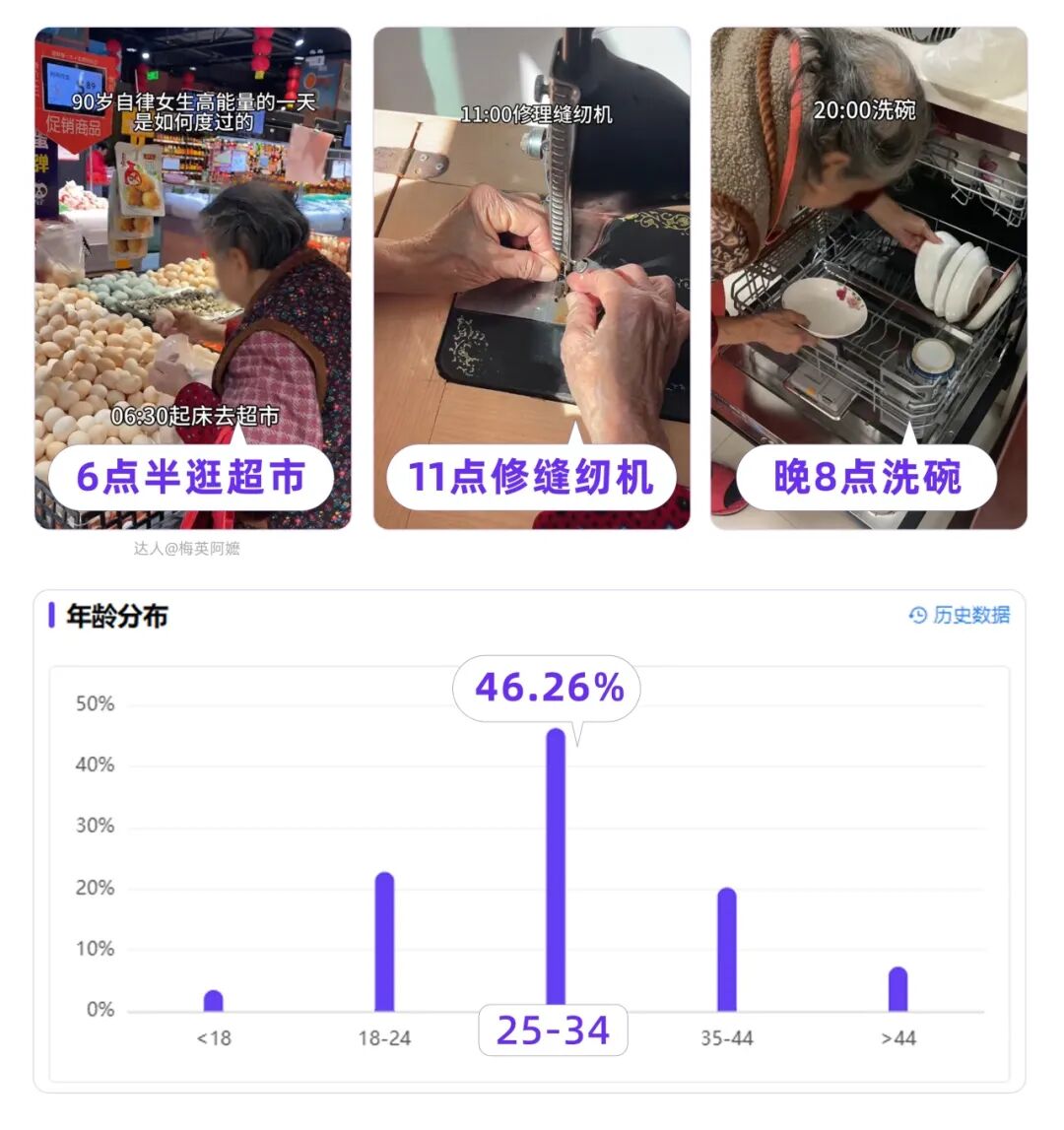 数据显示,@梅英阿嬷 粉丝年龄段25-34岁占比高达46%+,妥妥“90岁硬控90后”。