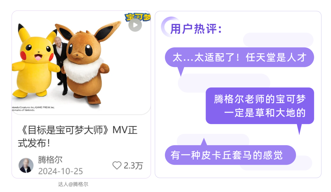 邀请腾格尔献唱《目标是宝可梦大师》,雄浑豪迈×童真幻想,截然不同的画风产生化学反应,一上线便在小红书掀起热潮,笔记分享量近3万。