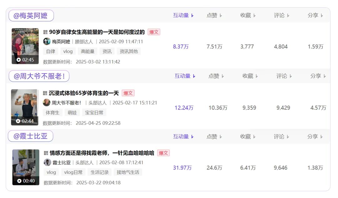 @梅英阿嬷 涨粉20万+,@周大爷不服老!、@霞士比亚 新增互动达百万级,粉丝涨速远超同量级达人。