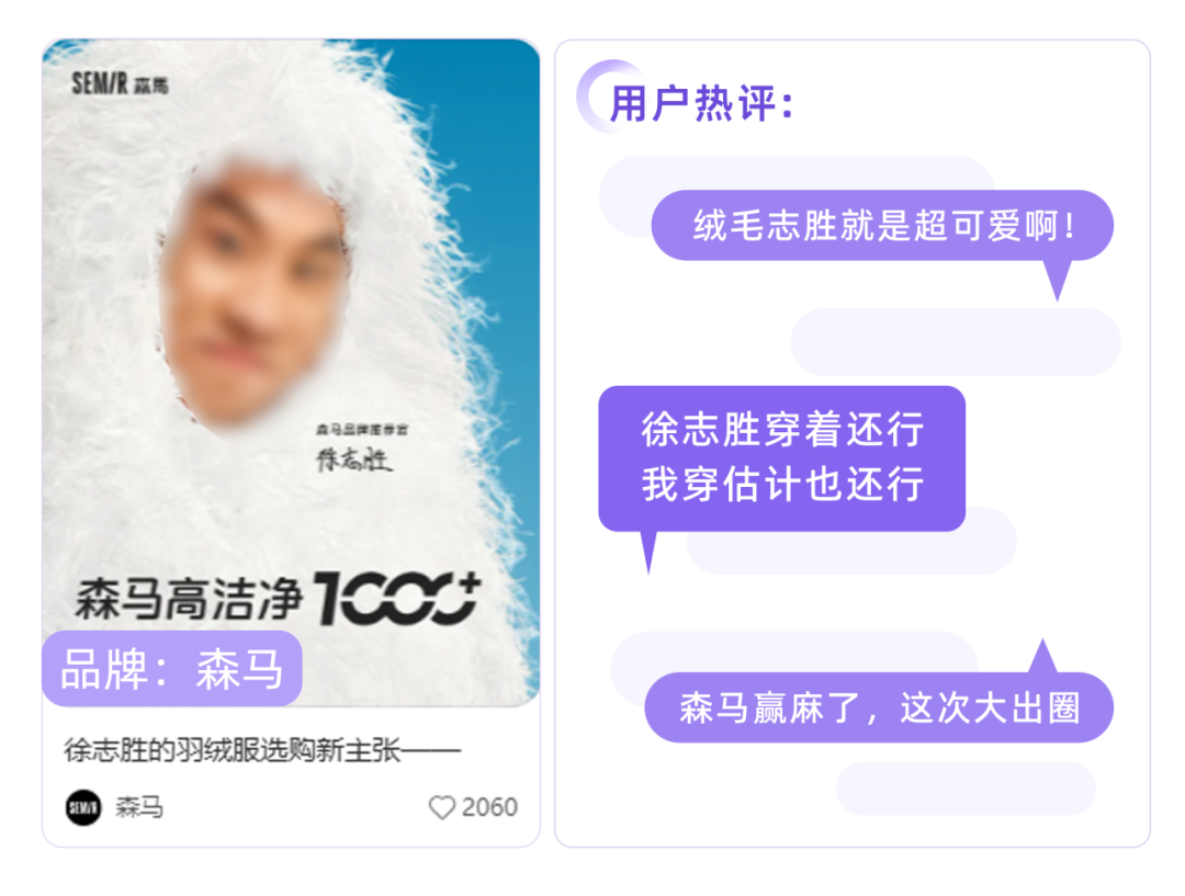 颠覆“高颜值”代言人的既定印象,合作徐志胜演绎“丑萌”短片,反向击中笑点,一下填平“买家秀”和"卖家秀"的鸿沟,品牌号笔记获千赞、高出平均水平3倍。