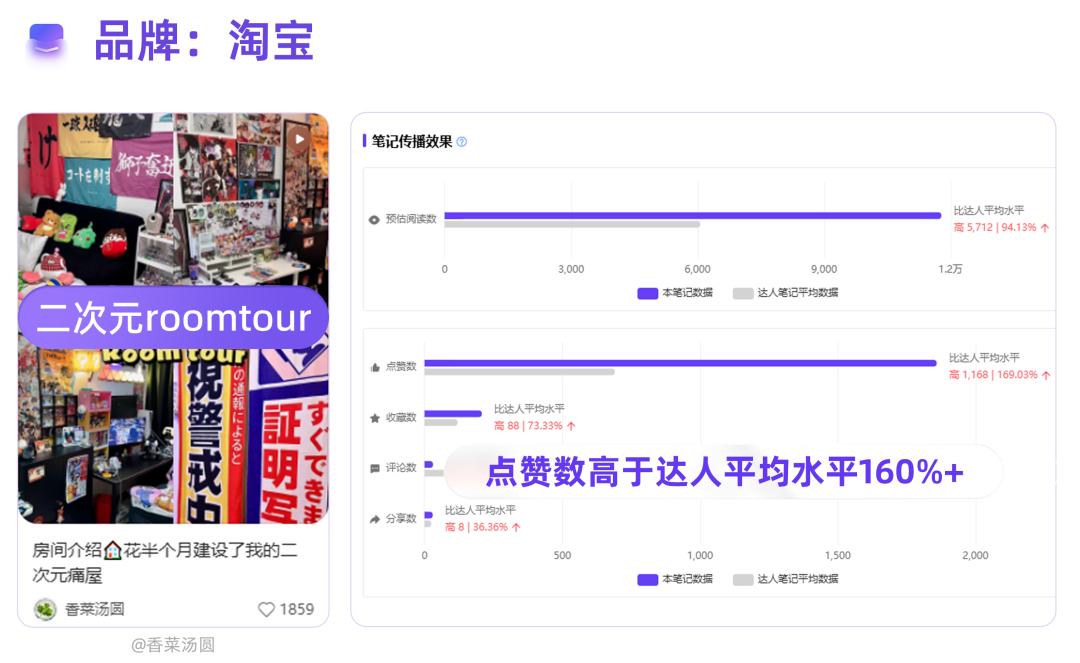 从大屏投影的追番区,到摆满周边的书桌、游戏角落,处处都彰显喜好。借二次元好物满减优惠,自然植入品牌活动,笔记点赞高出达人平均水平160%+。