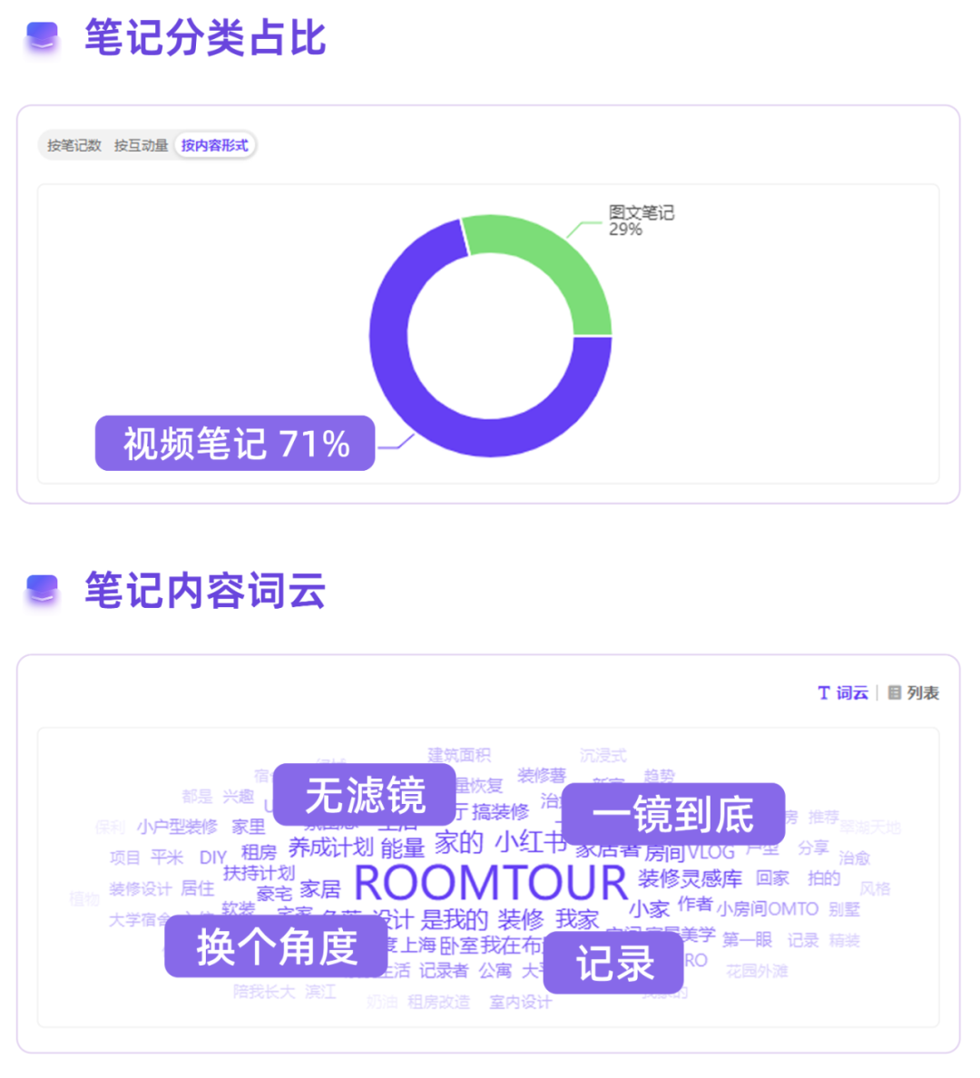 查看近90天Roomtour笔记数据,视频占比超70%,“一镜到底、无滤镜”等拍摄相关词汇频现。