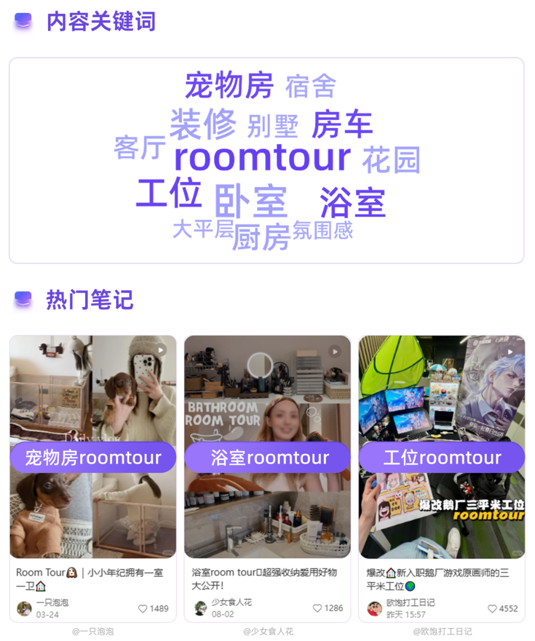 千瓜数据-笔记分析显示,随着内容创作的丰富,RoomTour不断裂变,从聚焦个人居住空间,拓展至多元场景,涵盖工位、房车、宠物空间等,背后蕴含着巨大的营销潜力。