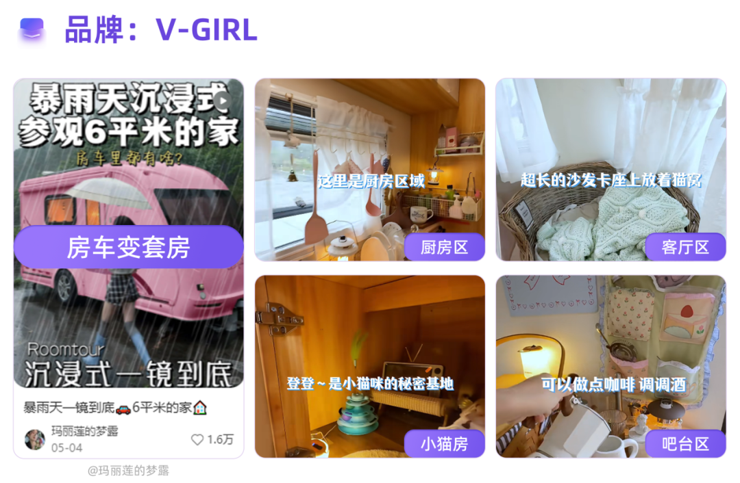 你的6㎡可能只是一间厕所,可她的6㎡却包含了厨房、卫生间、卧室、会客厅…甚至还能放下六人沙发,空间利用率拉满。同时,通过房车久坐场景,顺势植入 V-GIRL卫生巾,突出其“吸收快、透气不闷”的优势,获赞1.6万+。